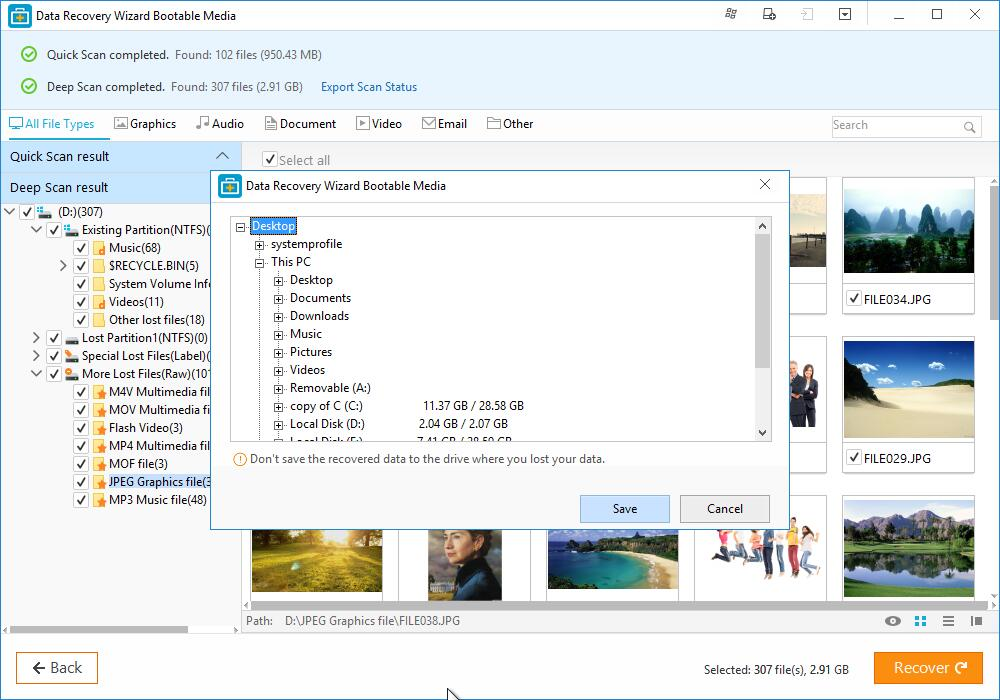إذا كان الحاسوب الخاص بك يعمل ، ولكن نظام التشغيل لا يقلع ، وتريد استرجاع ملفاتك المحفوظة على القرص الصلب الداخلي دون مشاكل ، فنقترح عليك أداة EaseUS Data Recovery Wizard with Bootable Media ، يمكنك حرق هذه الأداة الصغيرة على مفتاح USB أو على قرص CD واختيارها عند الإقلاع من أجل عرض القرص الصلب واسترجاع البيانات بكل سهولة ، ونقلها إلى جهاز تخزين أخر.