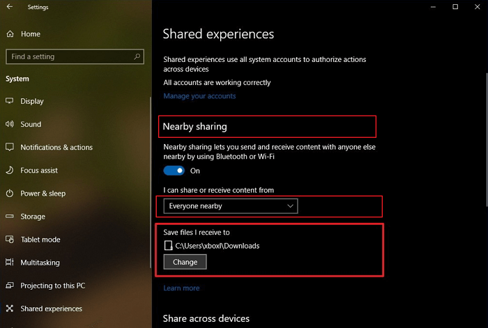 إنتقل إلى الإعدادات " Settings " ثم النظام " System " ثم التجارب المشتركة " Shared experiences" ثم قم يتشغيل زر المشاركة مع الأجهزة المجاورة .