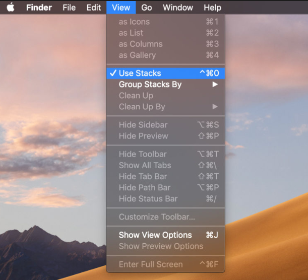 الخطوة الأولى : انتقل إلى عرض " View" أعلى سطح المكتب واختر استخدام المكدسات " Use Stacks".