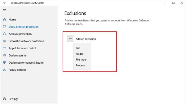ثالثا : قم بالتمرير لأسفل إلى المستبعدة "Exclusions" وانقر فوق إضافة أو إزالة المستبعدة " Add or remove exclusions".