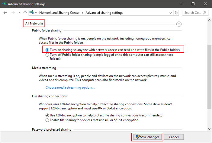 الخطوة 2 : قم بتوسيع علامة التبويب All Networks ، ضمن قسم المشاركة المحمية بكلمة مرور " Password protected sharing" ، حدد الخيار إيقاف تشغيل المشاركة المحمية بكلمة مرور " Turn off password protected sharing" أنقر فوق حفظ التغييرات " Save changes".