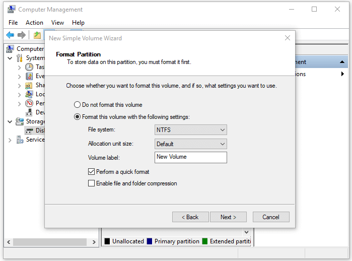 الخطوة 5 : اتبع المعالج لتحديد حجم وحدة التخزين ، وتعيين حرف محرك أقراص إلى وحدة التخزين ، ثم فورمات القسم.